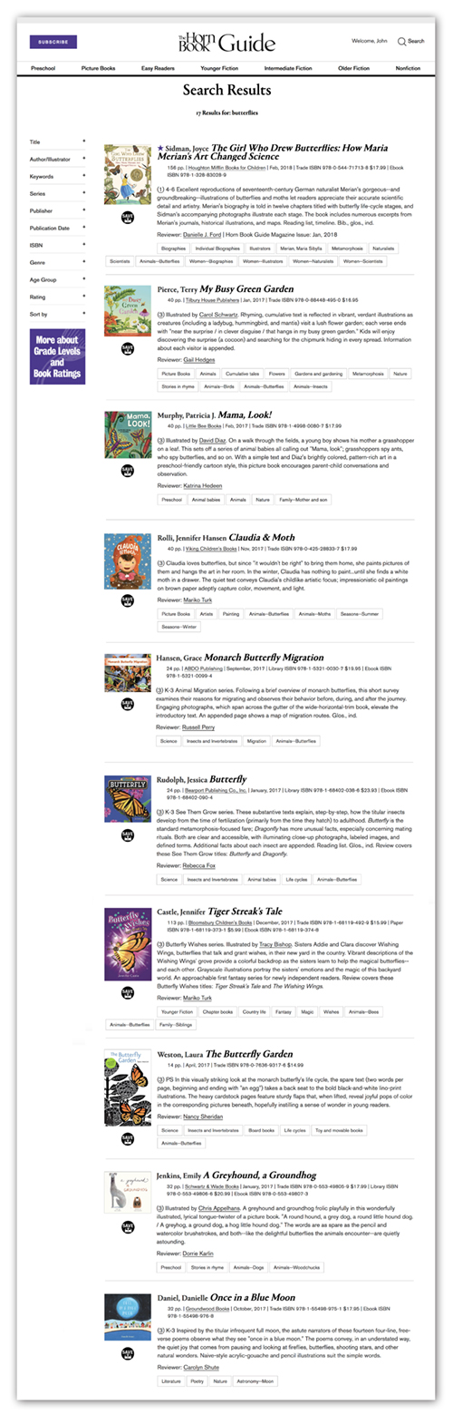 The Horn Book Guide Online is fully searchable by author/illustrator, title, subject, bibliographic data, rating, and keyword. New features include useful, timely, and topical booklists—curated by Horn Book editors and updated frequently—as well as the ability to save all your favorite titles to "My Library."